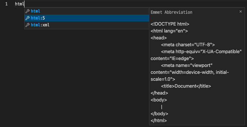 HTML 코드의 기본적인 형태가 자동 완성 기능으로 만들어집니다.